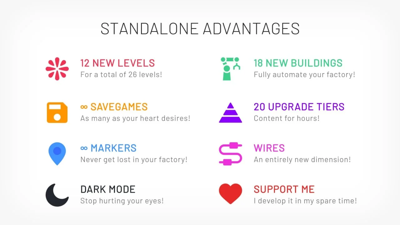Shapez.io — это увлекательная инди-игра в жанре автоматизации, где вы строите сложные производственные линии для создания различных геометрических фигур. Суть игры заключается в том, чтобы извлекать ресурсы, преобразовывать их с помощью различных механизмов и постепенно создавать всё более сложные формы.На первых этапах игроку нужно лишь вырезать базовые фигуры, но по мере прохождения задачи становятся сложнее: появляются требования к окраске, комбинированию и точной сборке. Увеличение...- ОС:Windows 10 (64-bit)