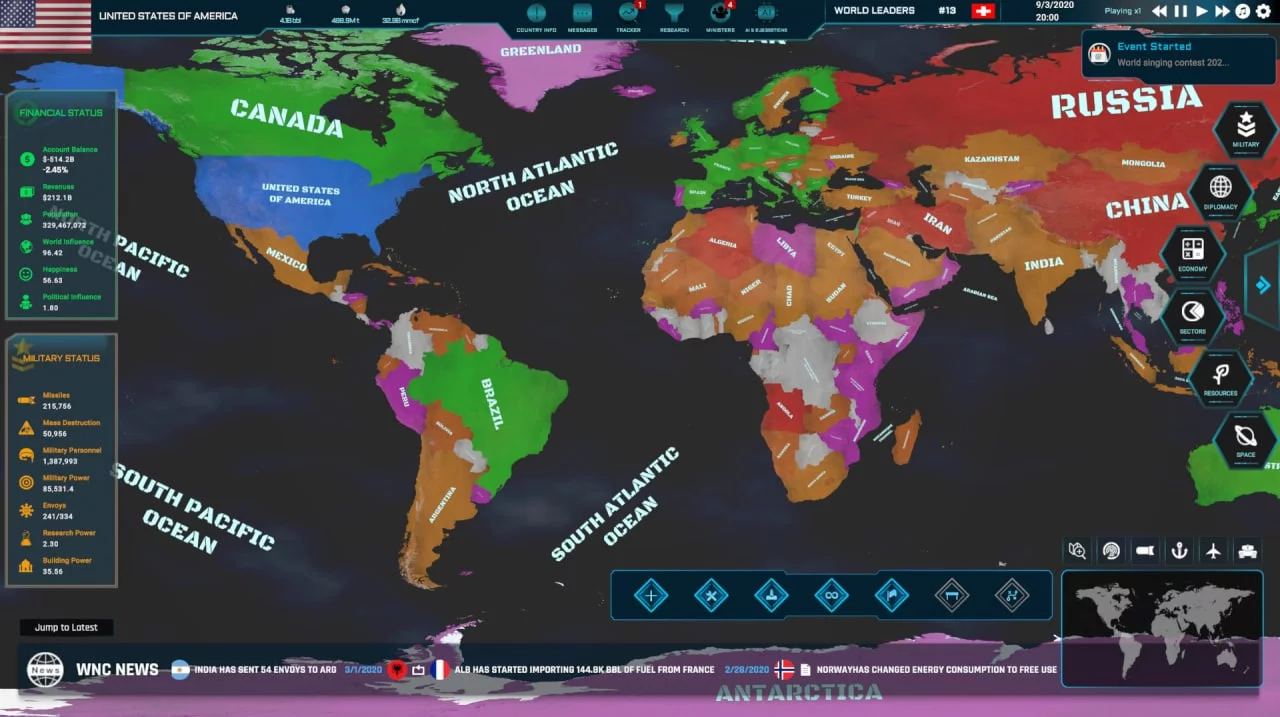 "World Warfare and Economics" - это захватывающая стратегическая игра, предлагающая игрокам уникальную возможность стать мировыми лидерами и управлять судьбой своей страны во всех аспектах: от политики и экономики до военных действий и космического исследования.С глобальной картой, охватывающей более 4000 регионов, игроки могут выбрать любую страну на планете и приступить к формированию своей стратегии. От принятия важных политических решений и разработки экономических политик до...- ОС:Windows 7, 8, 10 (64-bit)