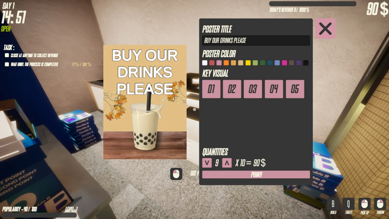 Boba Tea Shop Simulator — это увлекательная симуляционная игра, в которой вы становитесь владельцем собственной чайной с бобой и постепенно превращаете небольшой киоск в популярную точку притяжения. Игроку предстоит создавать напитки по рецептам или экспериментировать с ингредиентами, обслуживать клиентов с разными вкусами и характером, расширять меню и улучшать оборудование. В процессе вы управляете финансами, следите за уровнем удовлетворенности посетителей и развиваете бизнес, постепенно...- ОС:Windows 7, 8, 10, 11 (64-bit)
